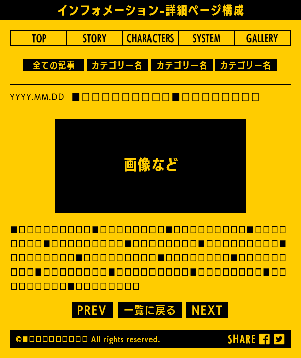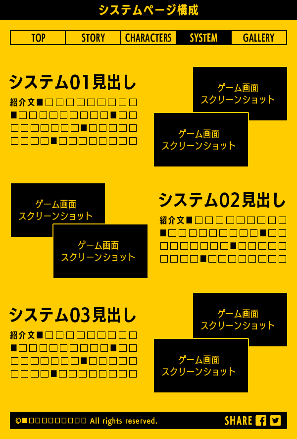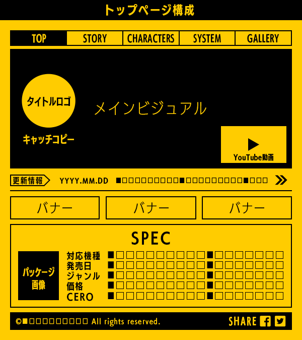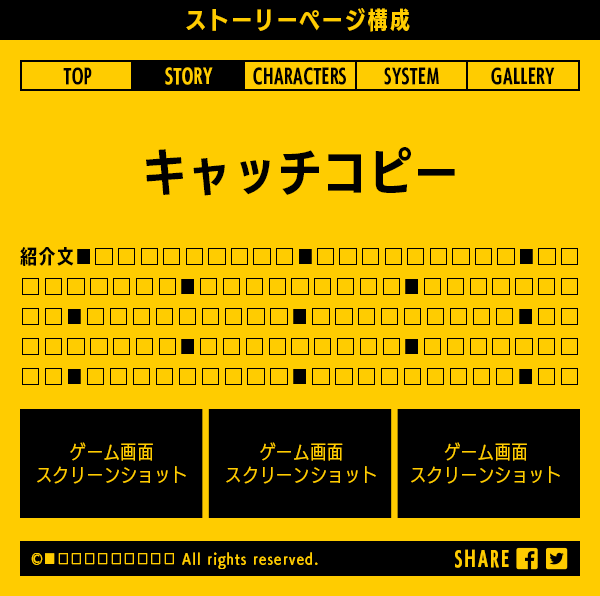 トップページ、ストーリー、キャラクター紹介、システム紹介、ギャラリーを含む5コンテンツのプランです。ページ構成要素は原則、ワイヤーフレームに則ります。初回の公開からリリースまでの期間で、段階的にコンテンツを公開・更新していく事も可能です。
